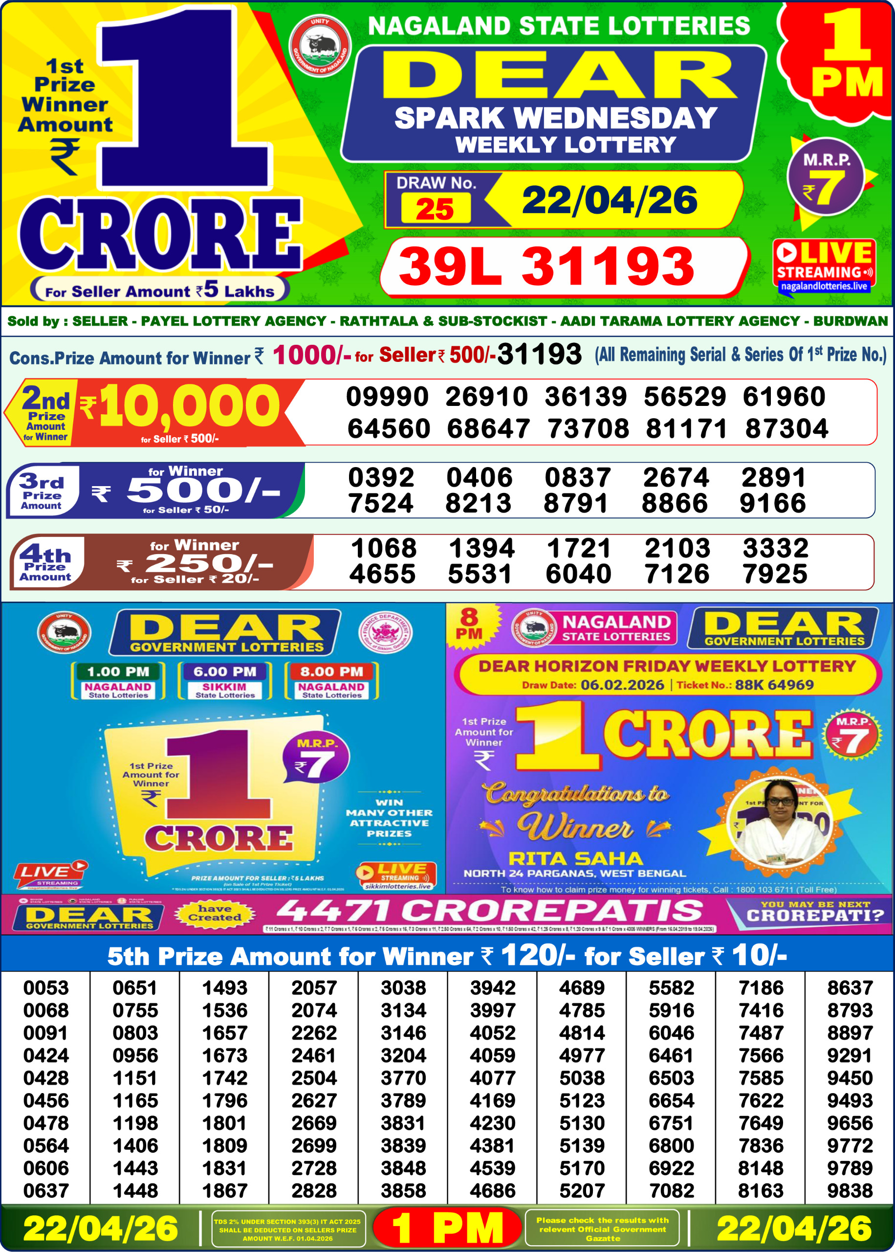 Dear Spark Wednesday Weekly Lottery result for April 22 2026. Nagaland Lottery Result, Lottery Sambad update for today. Organized by Nagaland.