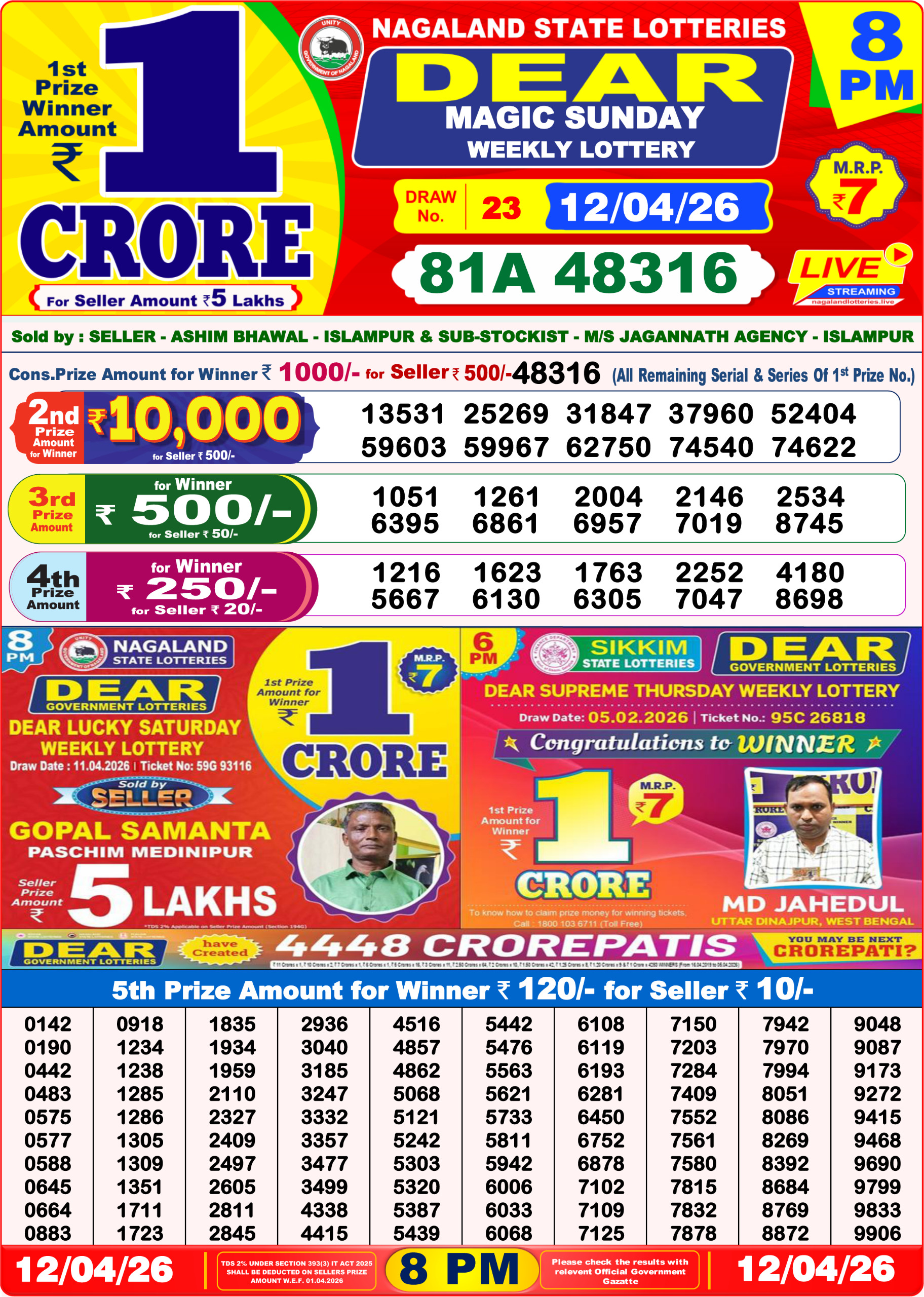 Dear Magic Sunday Weekly Lottery result for April 12 2026. Nagaland Lottery Result, Lottery Sambad update for today. Organized by Nagaland.