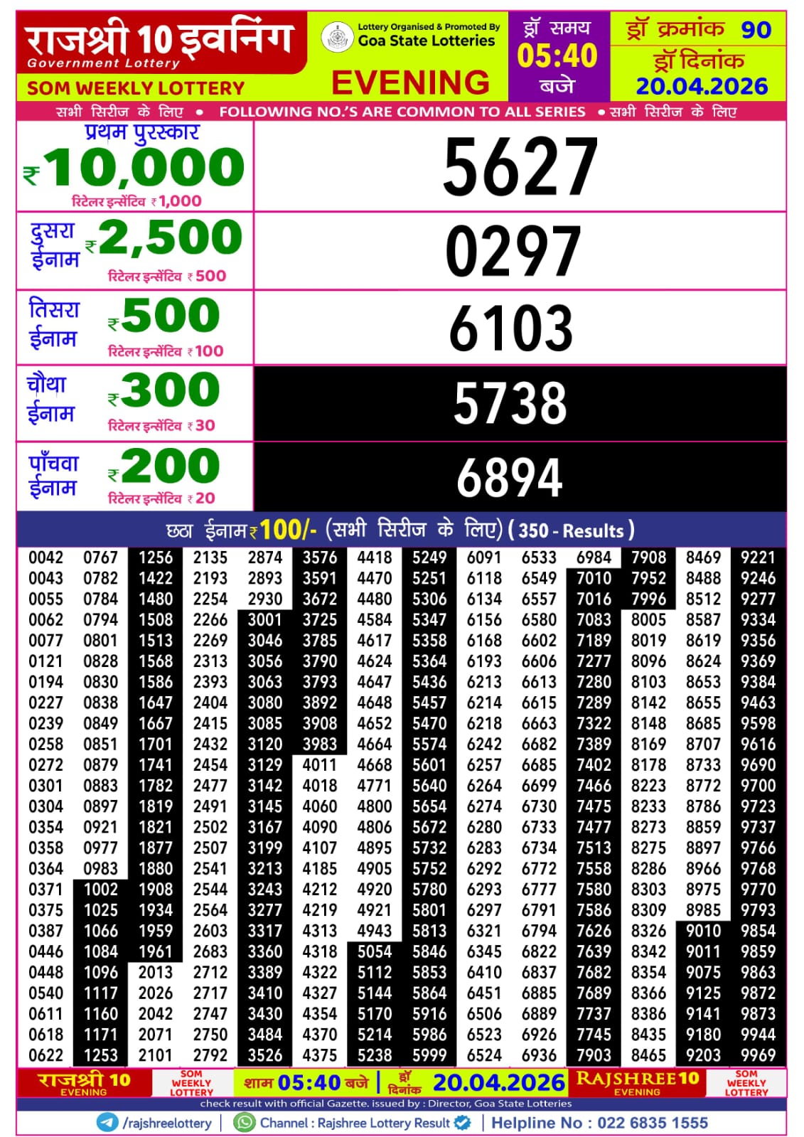 Rajshree 10 Evening Som Weekly Lottery result for April 20 2026. Goa Lottery Result update for today. Organized by Goa State.