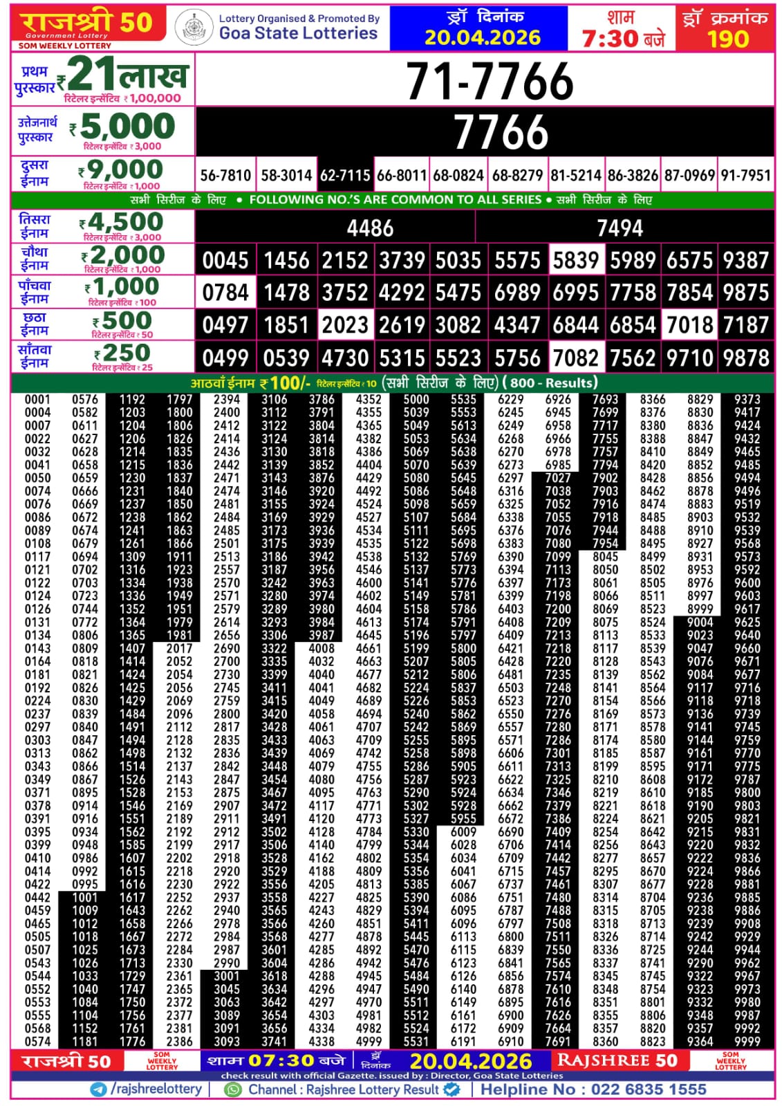 Rajshree 50 Som Weekly Lottery result for April 20 2026. Goa Lottery Result update for today. Organized by Goa State.