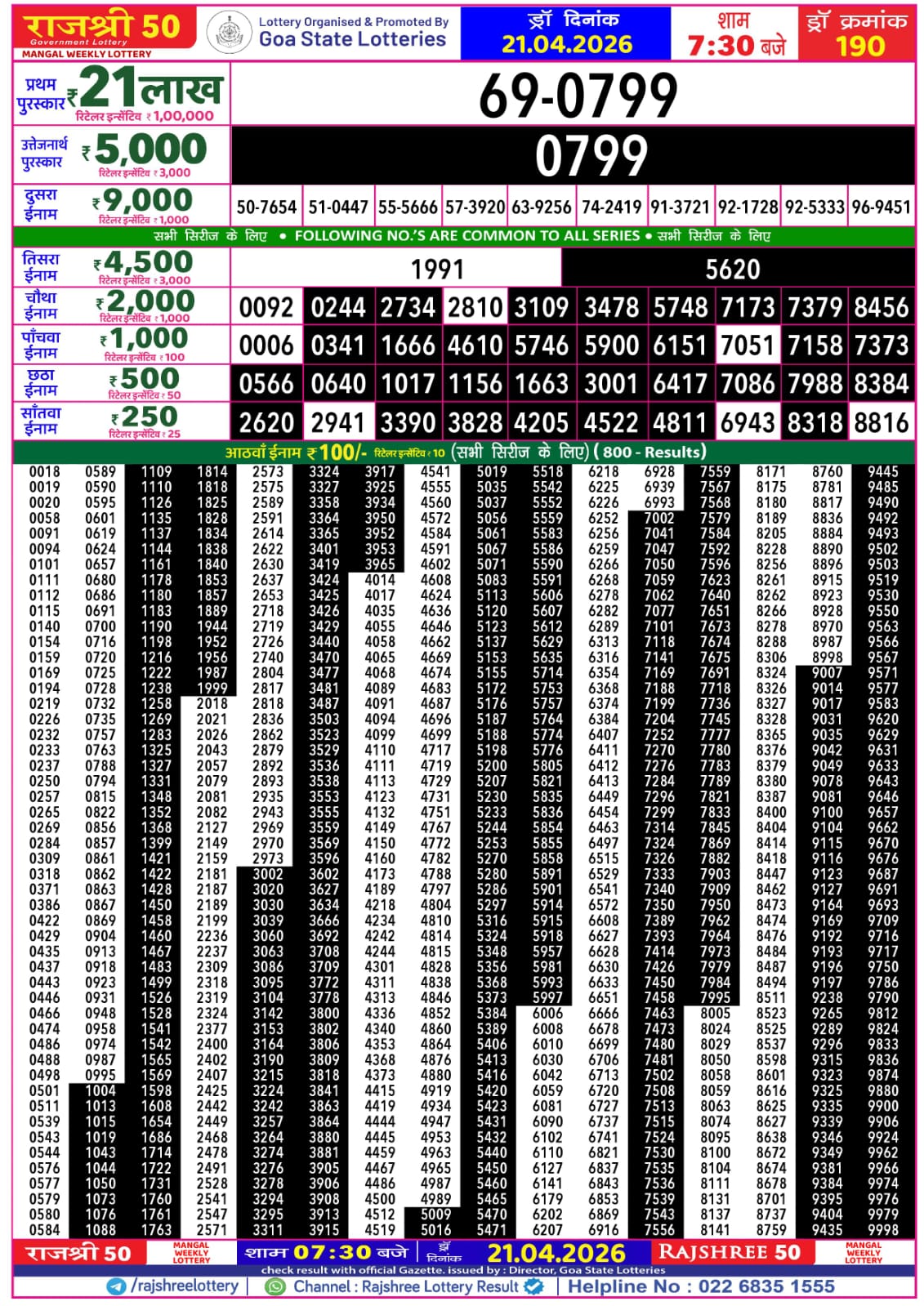 Rajshree 50 Mangal Weekly Lottery result for April 21 2026. Goa Lottery Result update for today. Organized by Goa State.