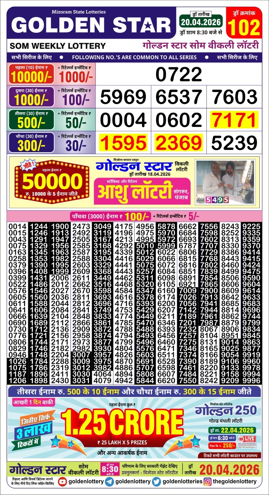 Golden Star 8:30PM Result result for April 20 2026. Mizoram Lottery Result update for today. Organized by Mizoram.