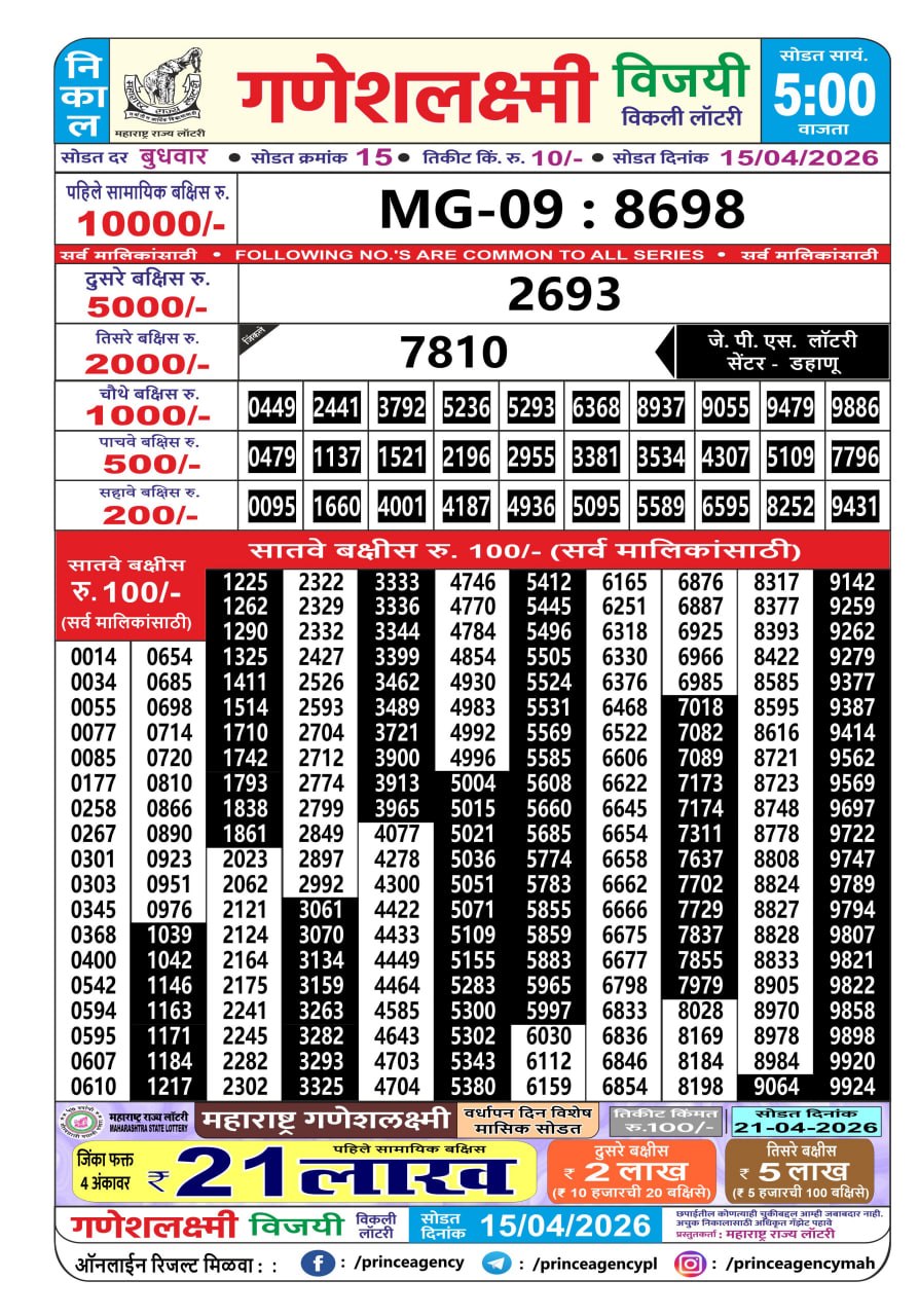 Maharashtra Ganesh Laxmi result for April 15 2026. Maharashtra Lottery Result update for today. Organized by Maharashtra.
