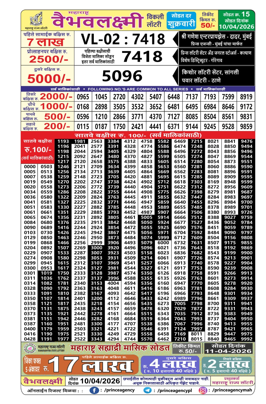 Maharashtra Vaibhav Laxmi result for April 10 2026. Maharashtra Lottery Result update for today. Organized by Maharashtra.
