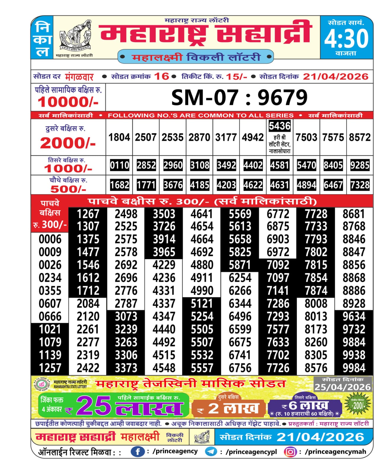 Maharashtra Sahyadri result for April 21 2026. Maharashtra Lottery Result update for today. Organized by Maharashtra.