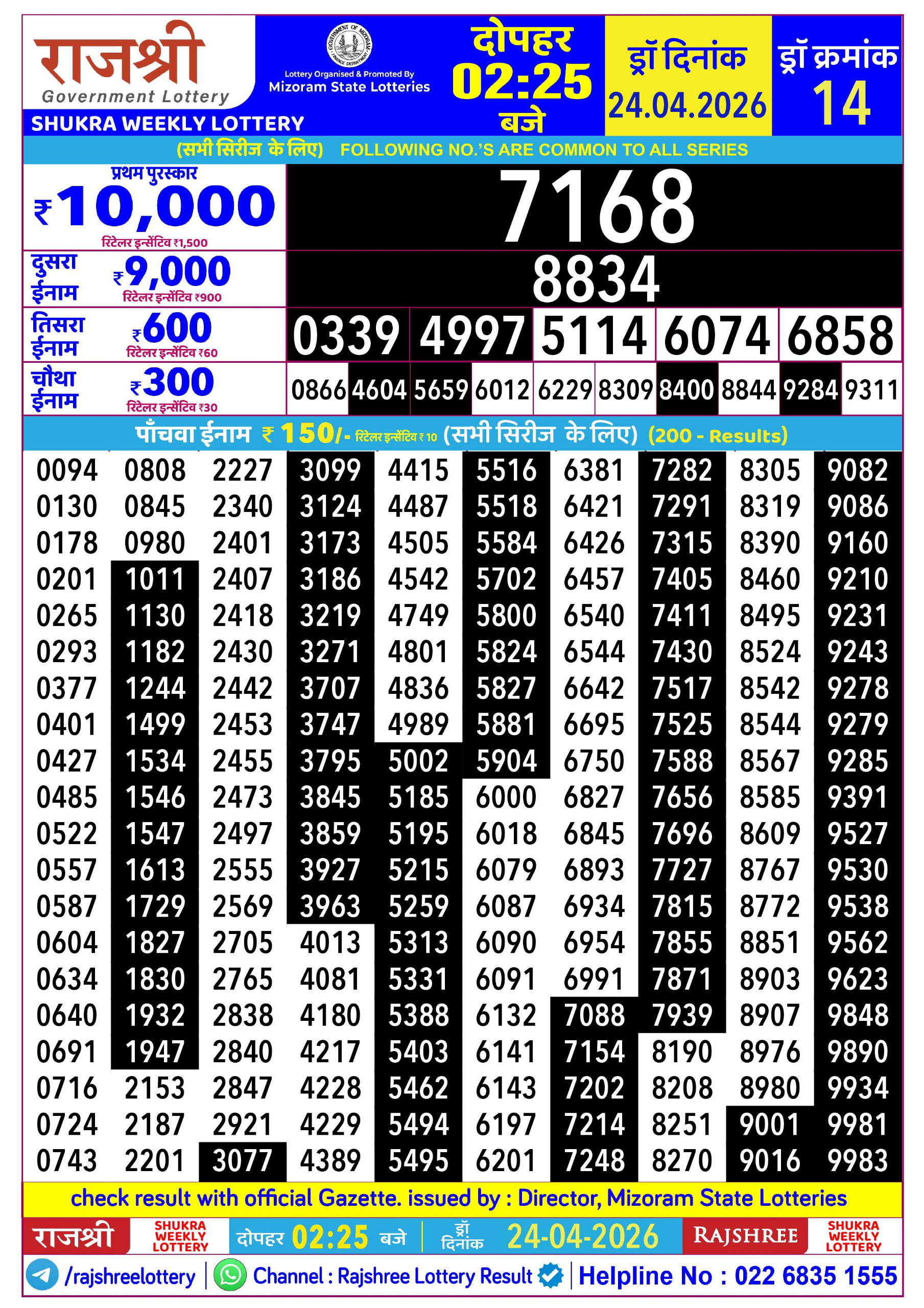 Rajshree Shukra Weekly Lottery result for April 24 2026. Mizoram Lottery Result update for today. Organized by Mizoram.