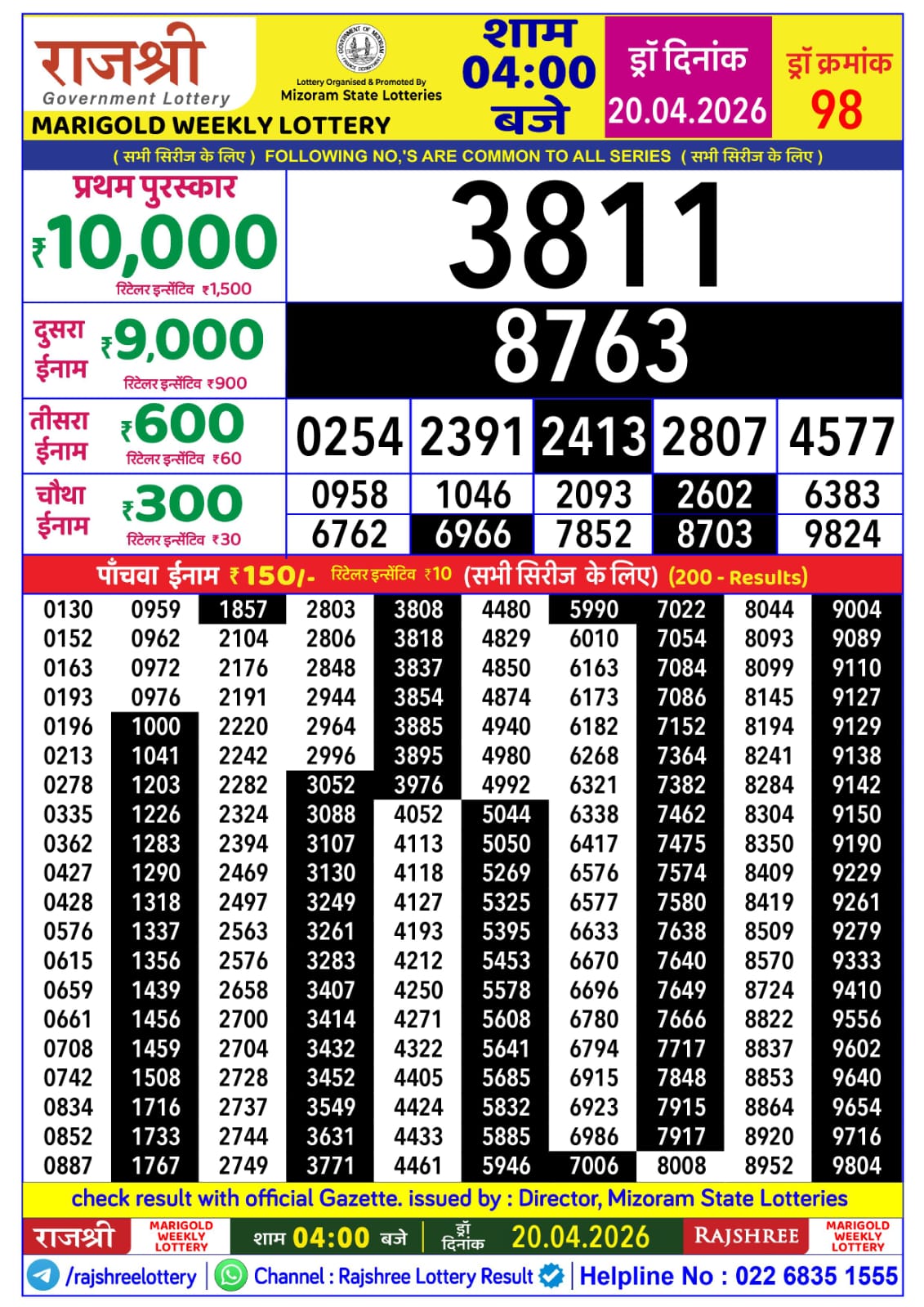 Rajshree Marigold Weekly Lottery result for April 20 2026. Mizoram Lottery Result update for today. Organized by Mizoram.