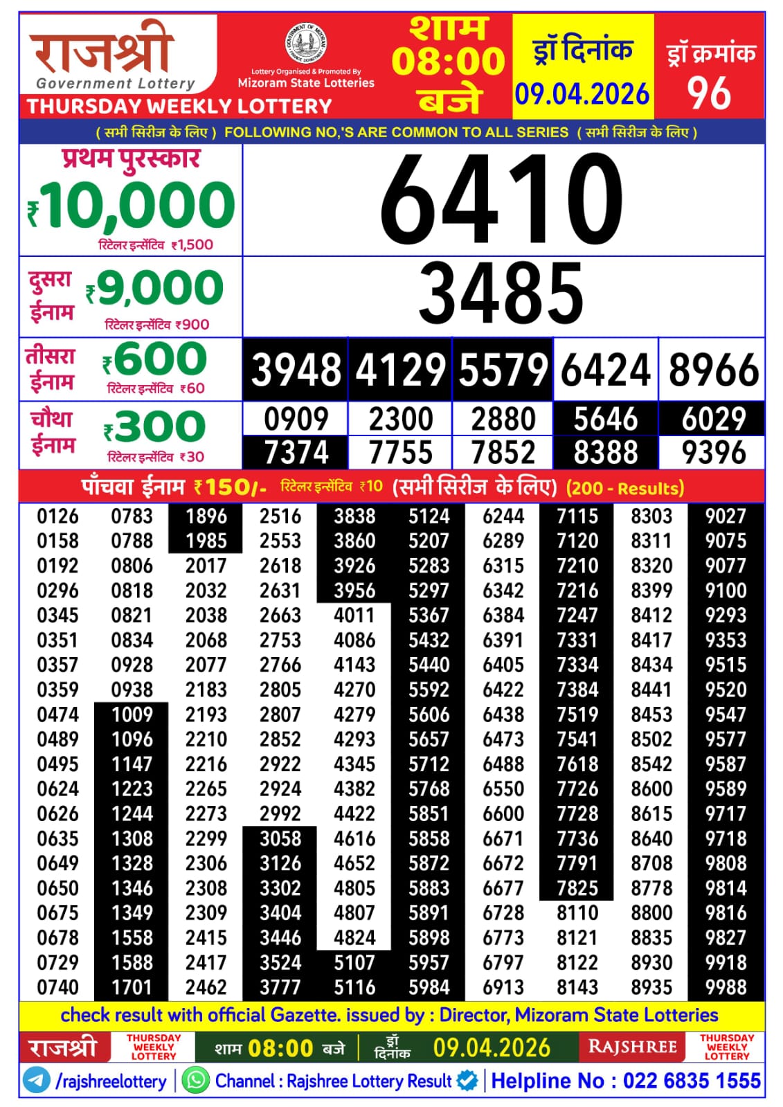 Rajshree Thursday Weekly Lottery result for April 09 2026. Mizoram Lottery Result update for today. Organized by Mizoram.
