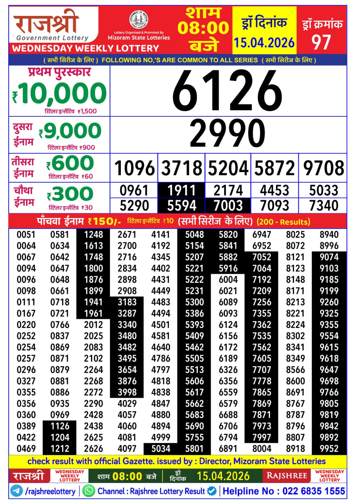 Rajshree Wednesday Weekly Lottery result for April 15 2026. Mizoram Lottery Result update for today. Organized by Mizoram.