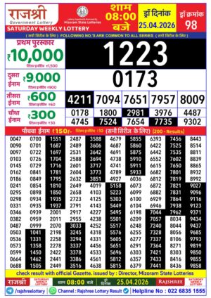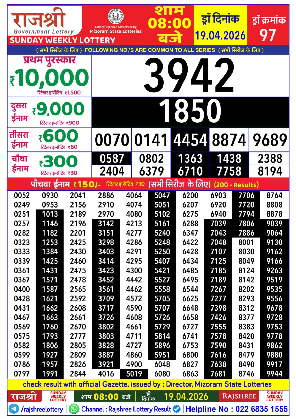 Rajshree Sunday Weekly Lottery result for April 19 2026. Mizoram Lottery Result update for today. Organized by Mizoram.