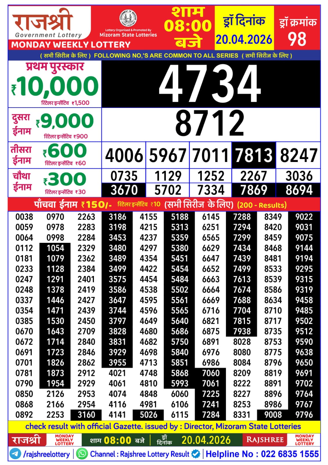 Rajshree Monday Weekly Lottery result for April 20 2026. Mizoram Lottery Result update for today. Organized by Mizoram.