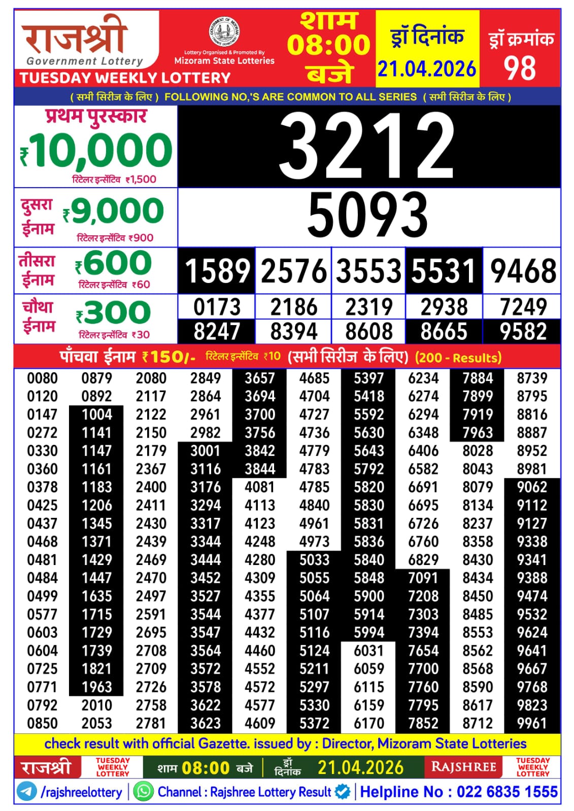 Rajshree Tuesday Weekly Lottery result for April 21 2026. Mizoram Lottery Result update for today. Organized by Mizoram.