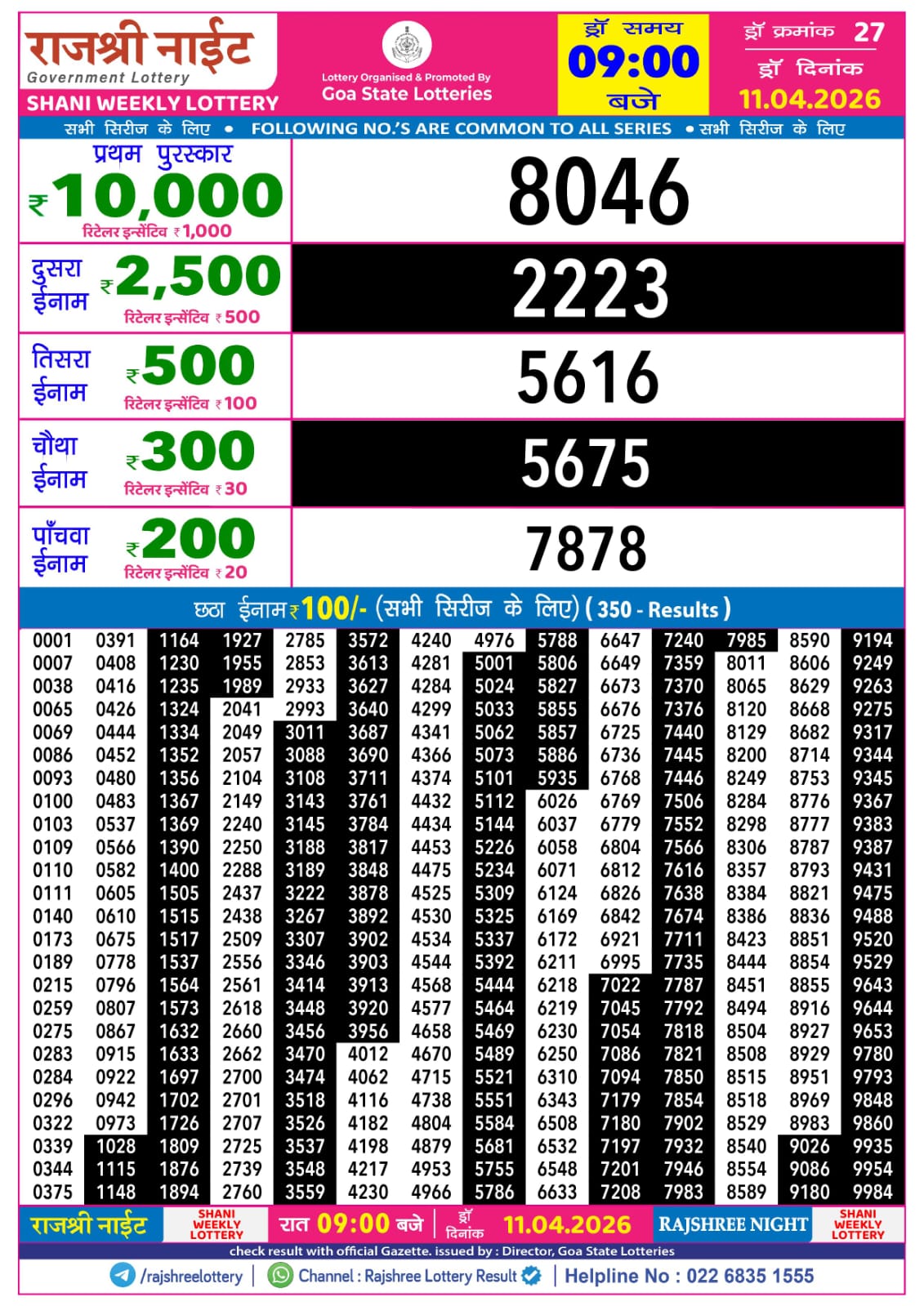 Rajshree Night Shani Weekly Lottery result for April 11 2026. Goa Lottery Result update for today. Organized by Goa State.