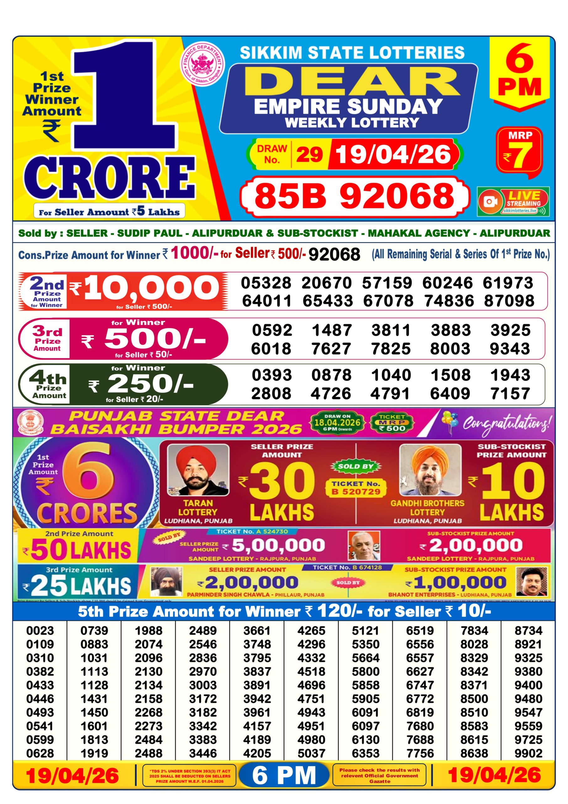 Dear Empire Sunday Weekly Lottery result for April 19 2026. Sikkim Lottery Result, Lottery Sambad update for today. Organized by Sikkim.
